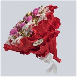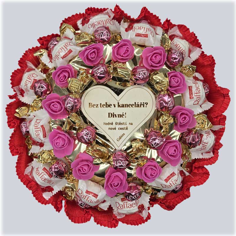 Hledáte dárek, který zaručeně potěší každého milovníka sladkého? Naše sladká kytice je mistrovským spojením dvou ikonických chutí! Kytice je ručně vytvořena z 19 lahodných jahodových pralinek Lexus a 12 bonbónů Raffaello, které jsou symbolem jemnosti a exkluzivity. Tato kombinace chutí je dokonalým překvapením pro každou příležitost. Celá kytice je elegantně zabalená v červené manžetě a převázaná zlatou stuhou, což dodává na luxusním dojmu. Doplněno 12 ks pěnových růžiček Srdcem celé kytice je dřevěné srdce, které si můžete nechat personalizovat podle svého přání. Díky našemu editoru si na něj můžete nechat vygravírovat vlastní text (např. jména, datum nebo osobní vzkaz) anebo na něj umístit osobní fotografii a text. Proměňte obyčejný dárek v nezapomenutelnou vzpomínku.